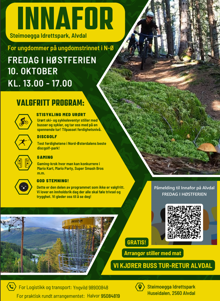 I vinterferien kom over 80 ungdommer til Rendalen for å kjøre ski i Renåfjellet. Denne gangen inviterer vi alle ungdomsskoleelever til Alvdal fredag(10.10) i høstferien! Der blir det stisykling med Urørt sykkelopplevelser, diskgolf og gaming. I tillegg til andre morsomme aktiviteter og markering av verdendagen for psykisk helse.