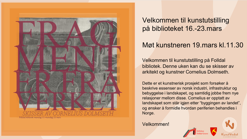 Velkommen til kunstutstilling på biblioteket 16.-23. mars. Denne uken kan du se skisser av arkitekt og kunstner Cornelius Dolmseth.