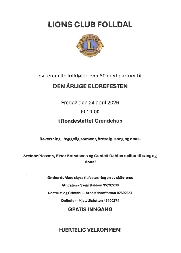 LIONS CLUB FOLLDAL inviterer alle folldøler over 60 med partner.