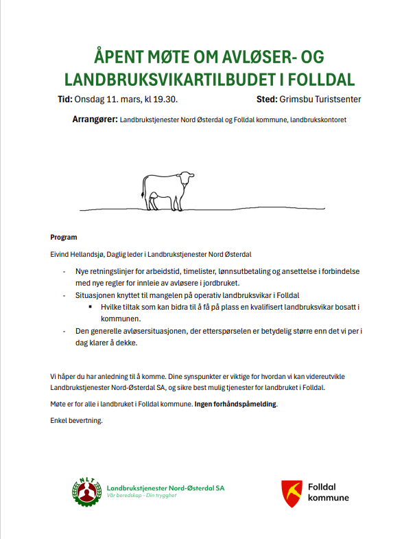 Åpent møte om avløser- og landbruksvikartilbudet i Folldal Publisert av Mona Røsten Publisert 05.03.2026 13.13