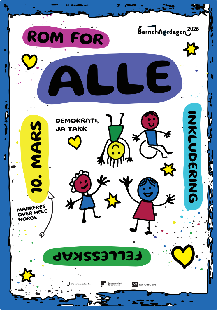 BARNEHAGEDAGEN 2026 arrangeres rundt om i hele landet tirsdag 10. mars. Første gang var i 2005, så dette har blitt en lang, årlig og nasjonal tradisjon. Hvert år har sitt tema og slagord. Tema i år er fellesskap og inkludering, og slagordet er «Rom for alle». Inkludering og fellesskap er en viktig del av barnehagens pedagogiske arbeid. Målet med dagen er å synliggjøre "livet" i barnehagen. Barnehagedagen arrangeres av Utdanningsforbundet, Fagforbundet og Foreldreutvalget for barnehager.