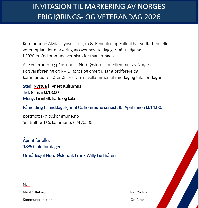 Markering av Norges frigjørings- og veterandag 2026Påmeldingsfrist: 30. April innen kl.14.00. Publisert av Mona Røsten Publisert 17.04.2026 10.49