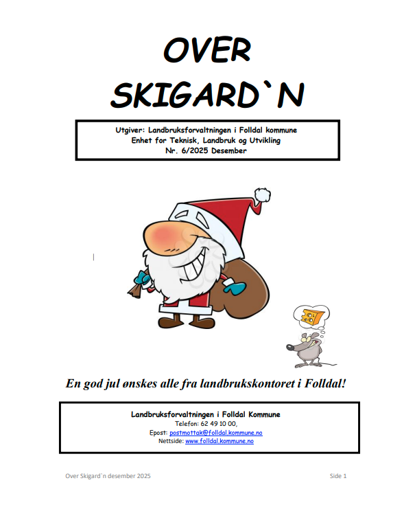 Over skigard`n desember 2025Nytt informasjonsblad fra landbruksforvaltningen i Folldal kommune. Link til Over skigard`n finner du her: Overskigard`n desember 2025 (PDF, 999 kB) Publisert av Mona Røsten Publisert 10.12.2025 09.25