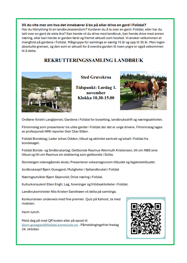 Påmelding til rekrutteringssamlinga i Folldal lørdag 1. november kan skje enten med QR koden på invitasjonen eller med epost til bjorn.gussgard@folldal.kommune.no . Påmeldingsfristen er 24. oktober