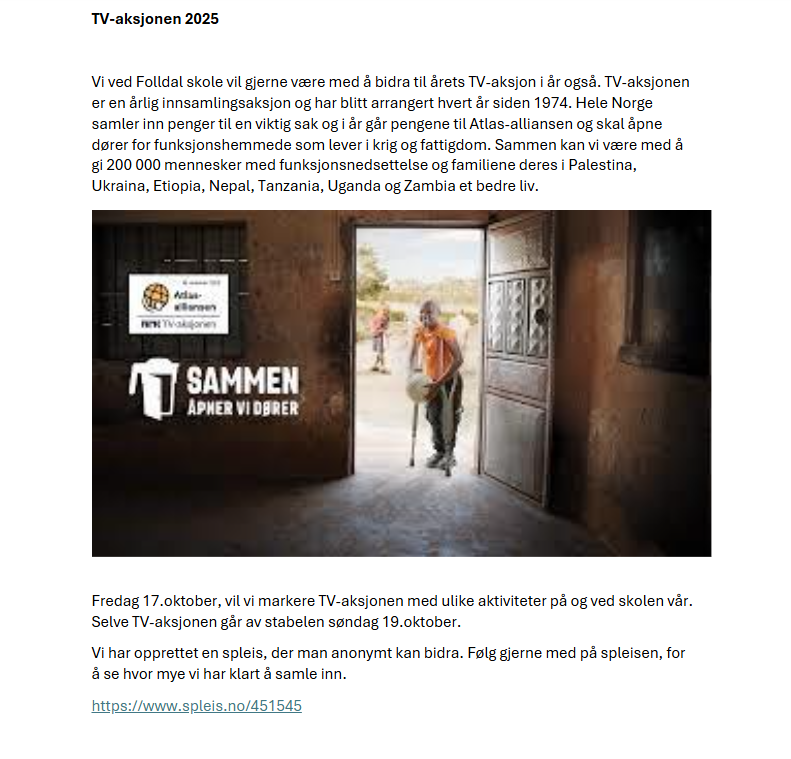 TV-aksjonen 2025 Tv-aksjonen 2025.docx (DOCX, 23 kB) https://www.spleis.no/451545 Hilsen elever og voksne ved Folldal skole Publisert av Mona Røsten Publisert 14.10.2025 07.57