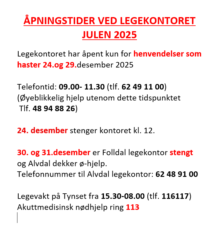 Viktig informasjon om legekontorets åpningstider og kontaktinformasjon for øyeblikkelig hjelp i julen 2025 Ønsker dere alle en god og fredelig jul Publisert av Mona Røsten Publisert 17.12.2025 08.10